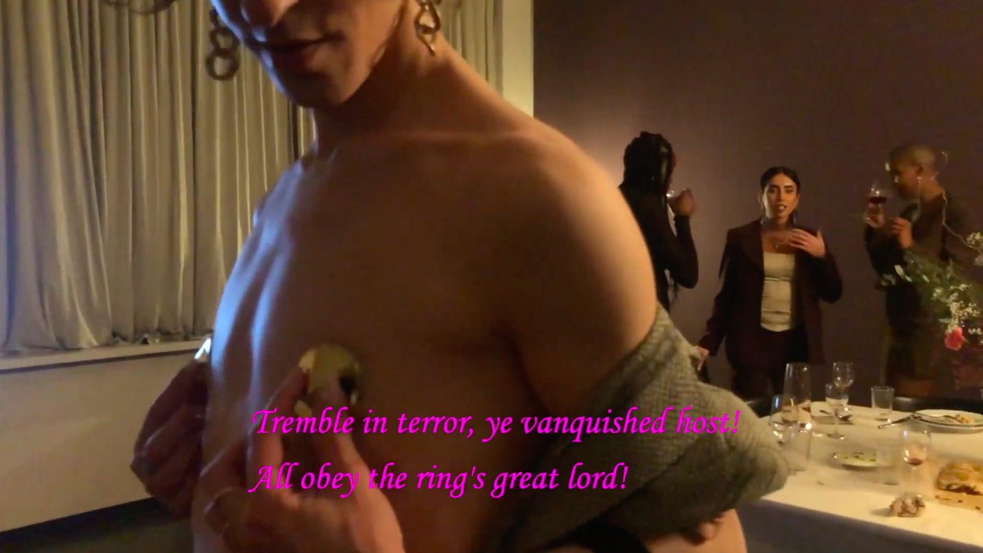 As participants of Alexander Fahima’s The Rules of Attraction, the revellers were the uninvited guests of Richard Wagner’s opera tetralogy, Der Ring des Nibelungen. Produced in March, 2021, for the Berlin Volksbühne’s digital performance series, Next Waves Theatre, Fahima’s opéra concrète exists somewhere between house party, live performance, video stream, and mail art. As a video work, the film follows a party in real time, filmed with sparse directorial cues on the participants’ smartphones but with its soundtrack and subtitle text taken from the original opera. Frame by frame, the libretto imparts meaning to the scenes. At times, the scenes suggest teasing enactments of the drama, but Wagner never dictates the content of the performance. Only at a few points—for example, a solo by performance artist Steph Quincy or an action painting by artist Mauro Ventura—does the camera cease wandering with its operator’s attention. But, even these moments are self-directed responses to the camera’s surroundings. As night rolls into day, the opera stays open to improvisational, vernacular forms of participation—in short, a party.